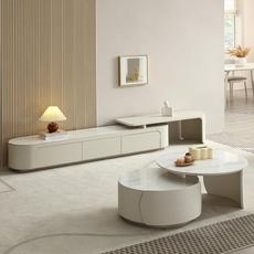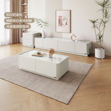 奶油风茶几电视柜 白亮光岩板台面大容量储物柜